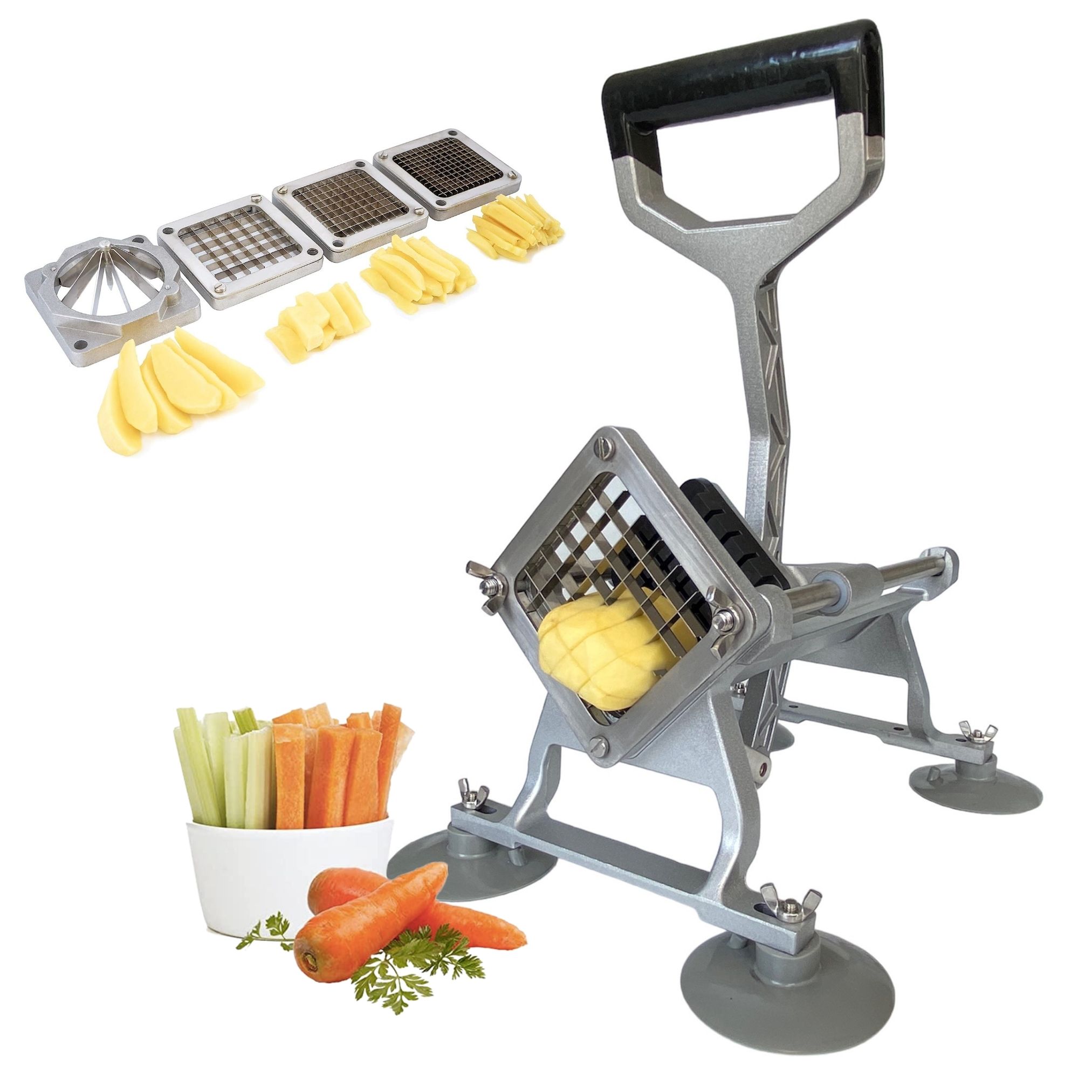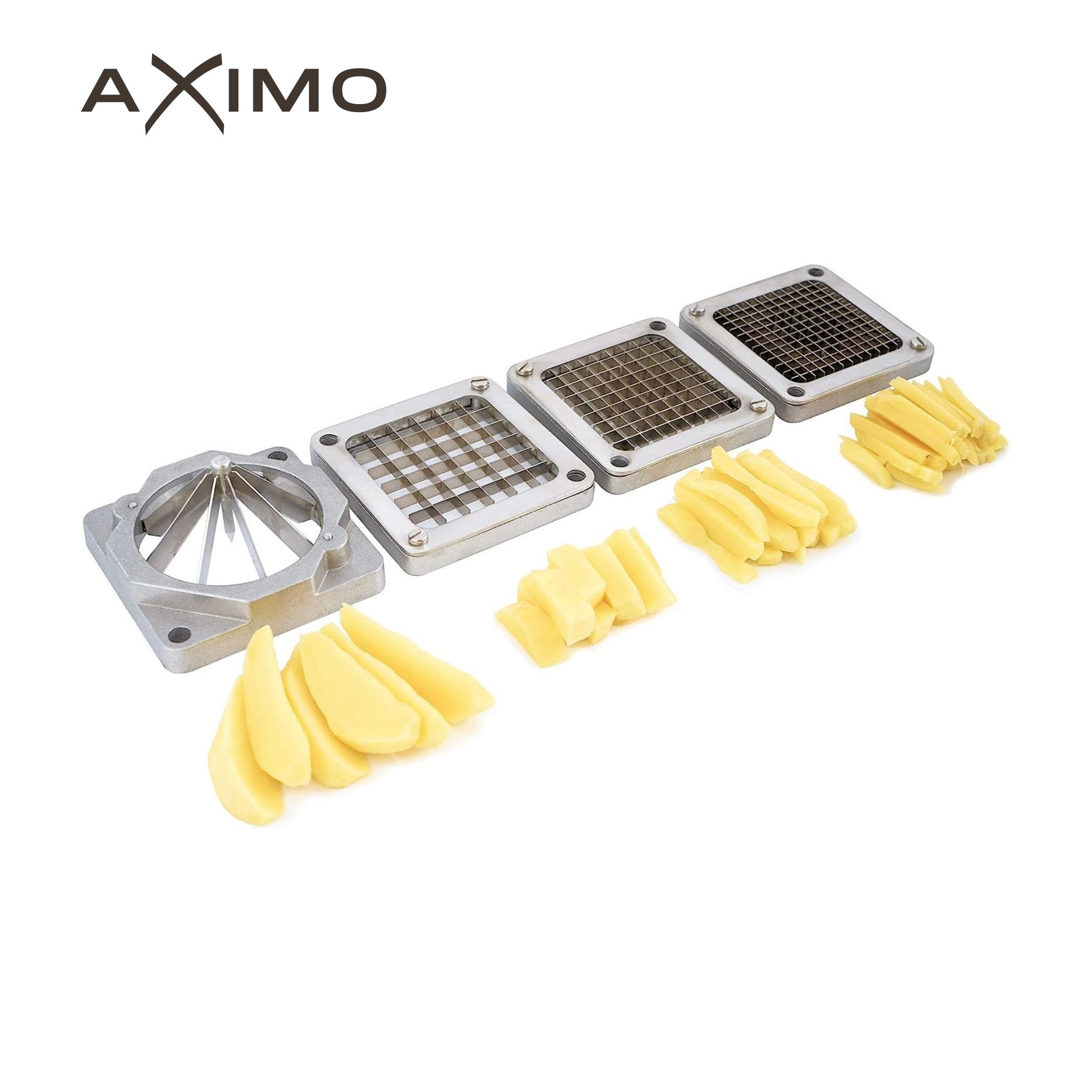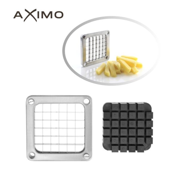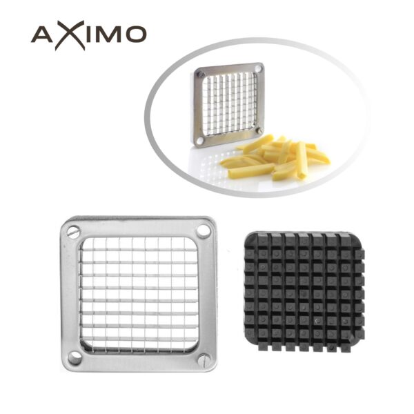 AXIMO Professionele Frietsnijder. Creëer perfect gesneden frietjes en groenten met de AXIMO professionele frietsnijder. Deze hoogwaardige snijder is ideaal voor zowel de professionele keuken als thuisgebruik. De set wordt geleverd met vier messen (6, 9, 13 mm) en een speciaal mes voor aardappelpartjes, waardoor je allerlei frietvariaties en groentesnacks kunt maken.