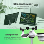 Ontdek de ultieme weersmonitoring met het AXIMO Wi-Fi weerstation, voorzien van geavanceerde sensoren en een helder kleurendisplay. Dit professionele weerstation biedt gedetailleerde informatie over UV-stralen, luchtvochtigheid, windsnelheid en -richting, luchtdruk, buitentemperatuur, gevoelstemperatuur en neerslag. De draadloze buitensensor, aangedreven door zonne-energie en batterijen, verzendt gegevens tot 150 meter naar het weerstation.
