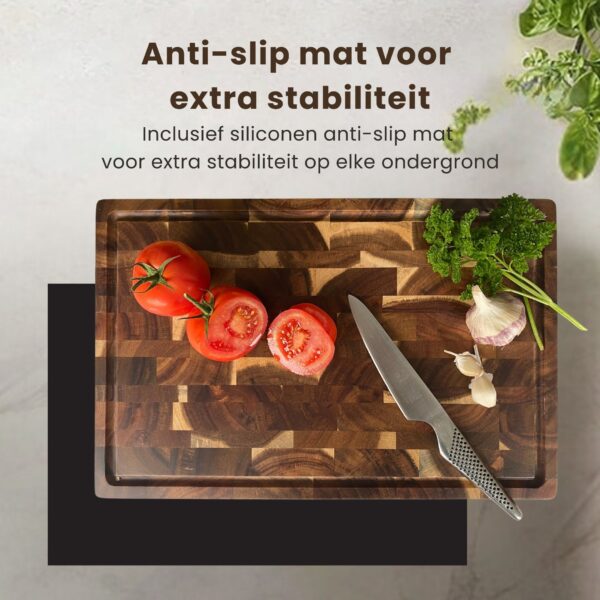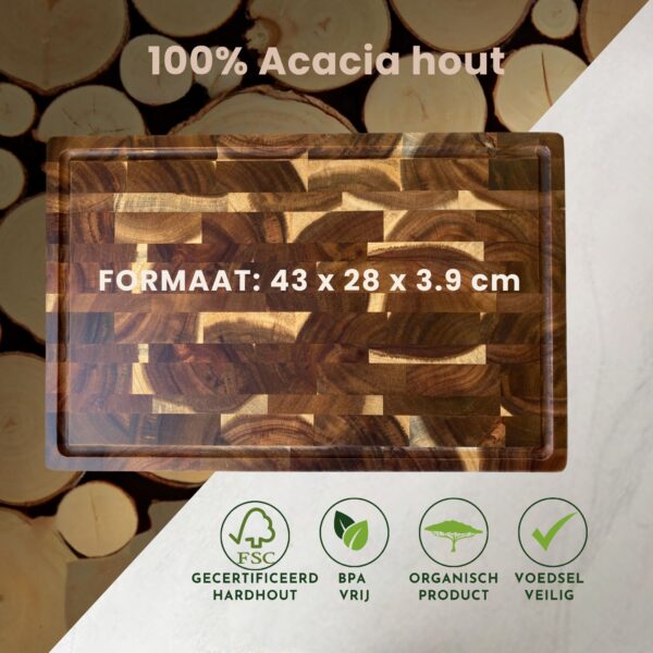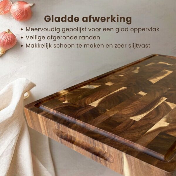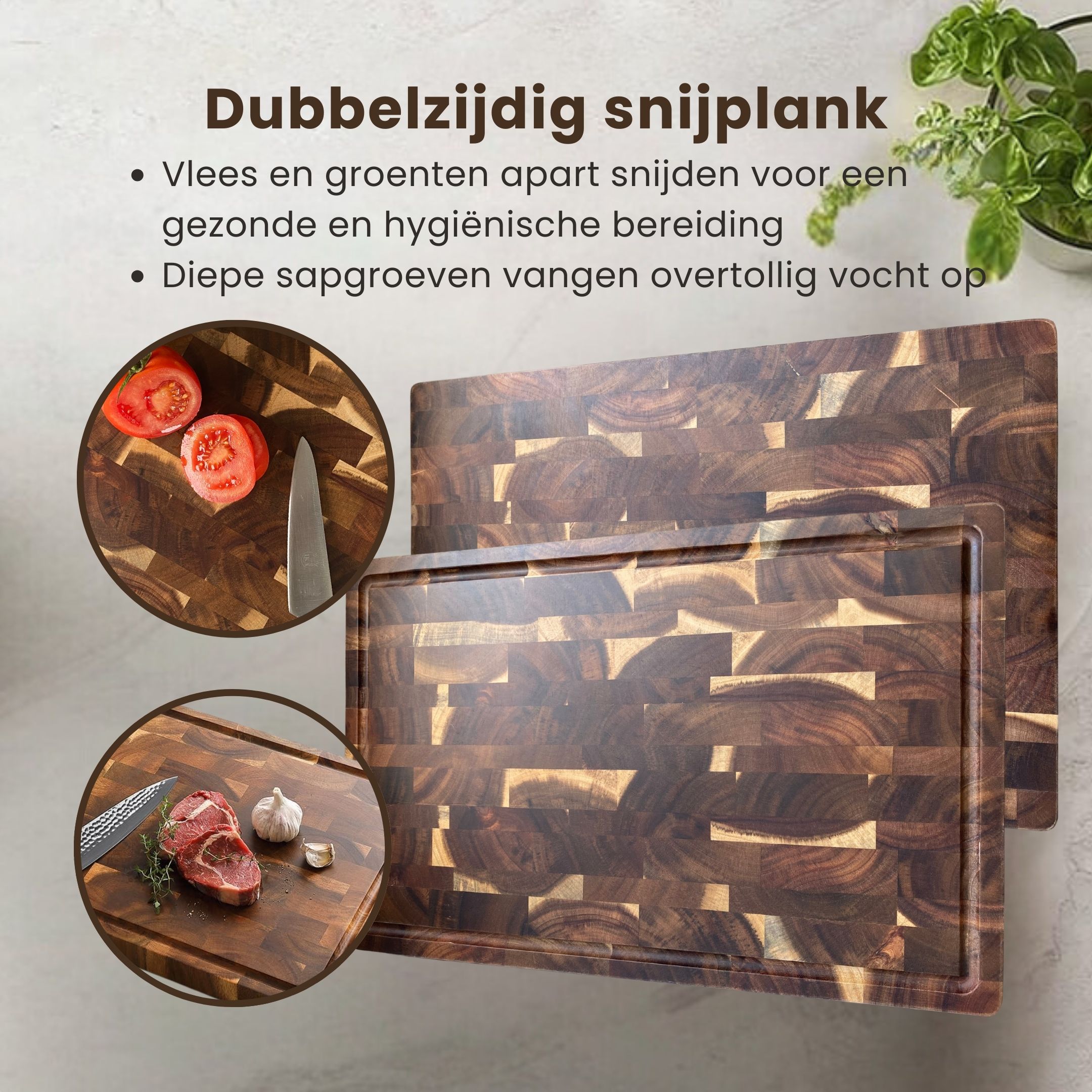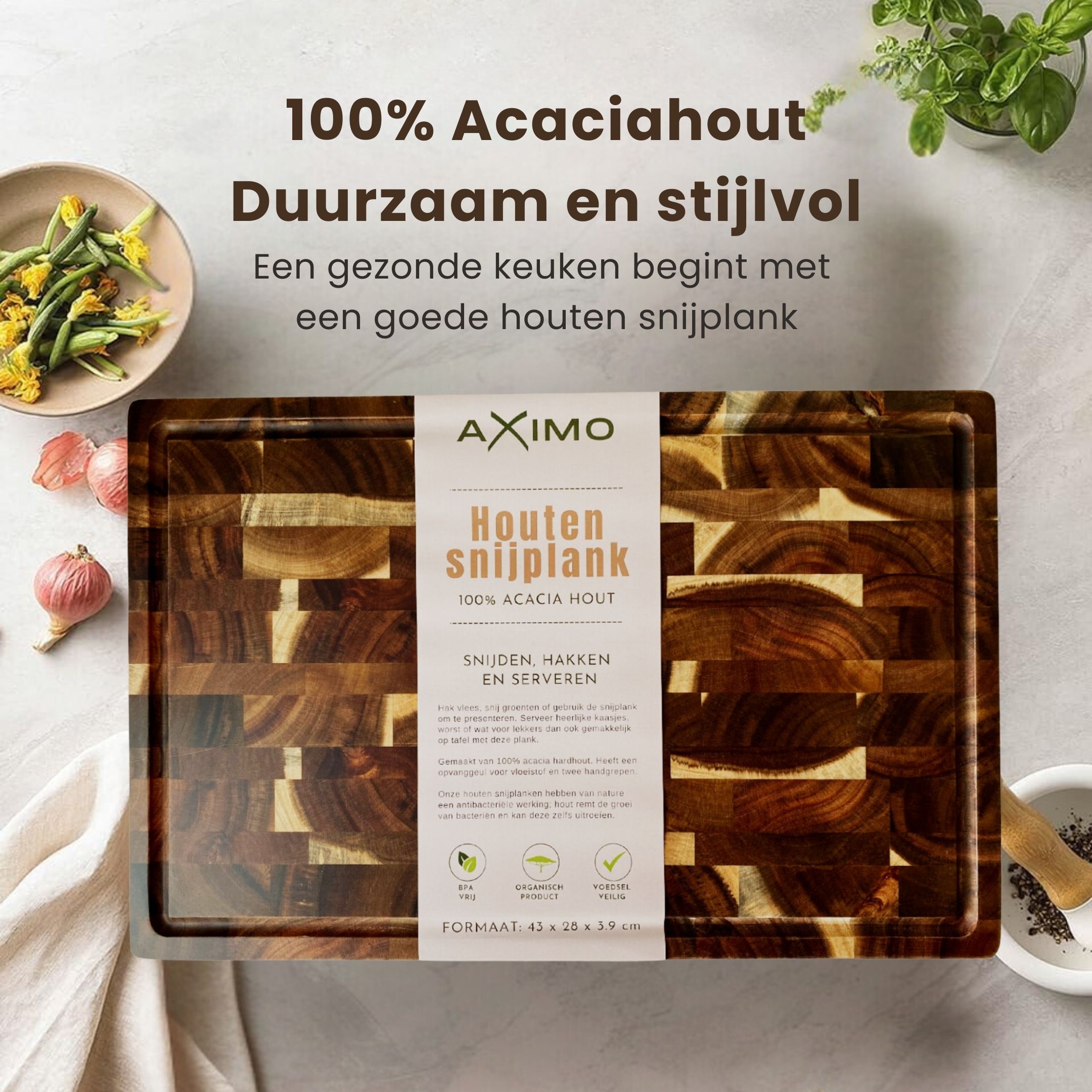De AXIMO Professionele Snijplank van massief acaciahout combineert duurzaamheid, functionaliteit en stijl. Dankzij het kopshouten ontwerp en de antibacteriële eigenschappen is deze snijplank perfect voor al je dagelijkse keukenklussen en het presenteren van hapjes. Gemaakt van hoogwaardig massief acaciahout, biedt deze plank een robuuste uitstraling en een mesvriendelijk oppervlak. Het ontwerp omvat een ril voor het opvangen van vocht en kruimels en gefreesde handgrepen voor eenvoudig hanteren. Gebruik beide zijden van de snijplank voor veelzijdig gebruik. Acaciahout heeft inderdaad natuurlijke antibacteriële eigenschappen, wat betekent dat bacteriën zich minder goed kunnen vermenigvuldigen op het oppervlak dan op bijvoorbeeld plastic of zachter hout. Dat draagt indirect bij aan een gezondere keukenomgeving, vooral als je veel met rauw vlees, vis of groenten werkt.