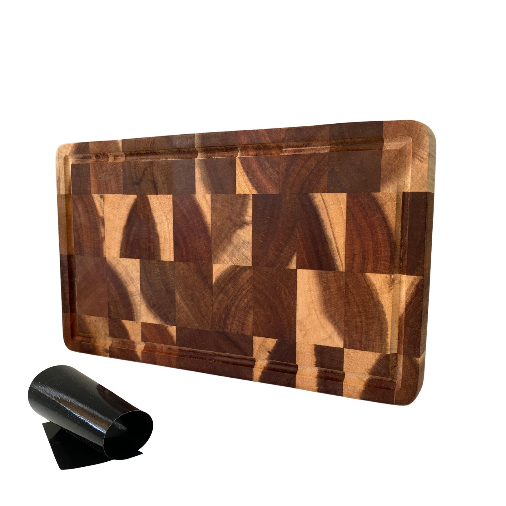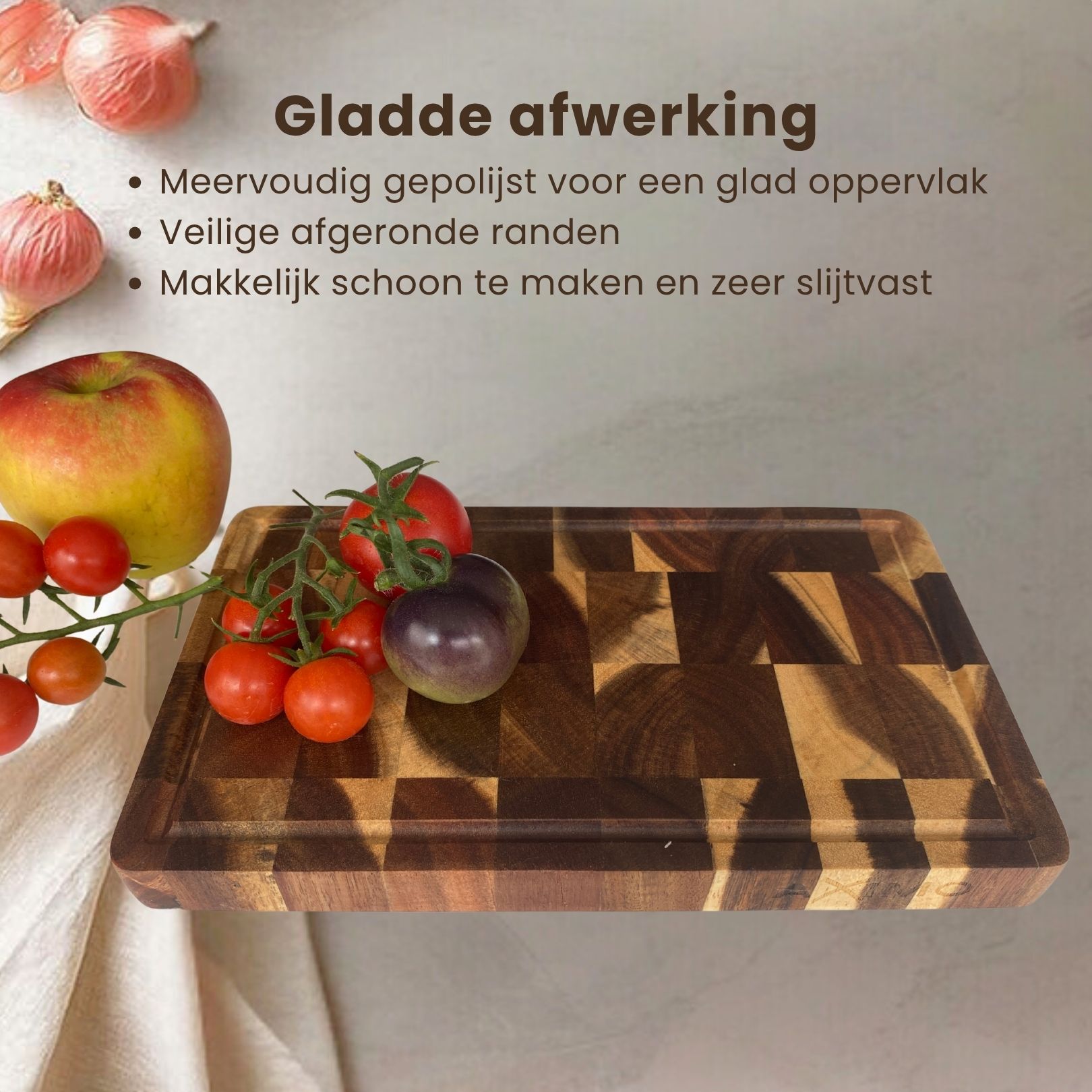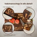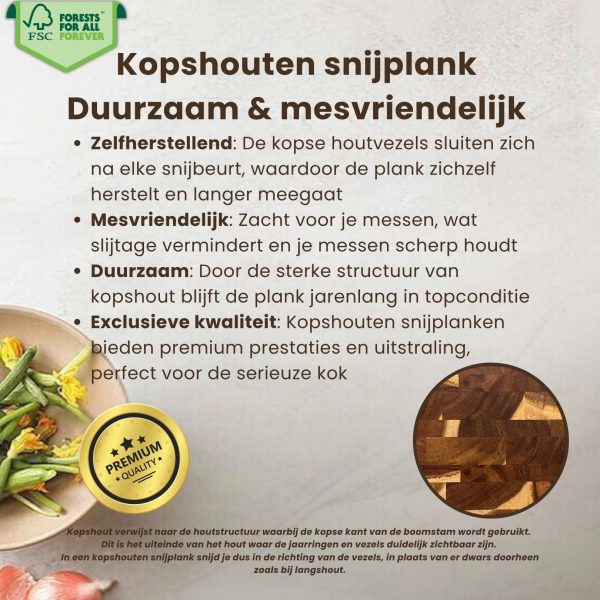 Wat deze snijplank écht bijzonder maakt, is het gebruik van kopshout. Kopshout betekent dat de houtvezels verticaal staan, waardoor je mes in de vezels snijdt zonder ze te beschadigen. Dit zorgt niet alleen voor minder slijtage aan je messen, maar maakt de snijplank ook extreem duurzaam en zelfherstellend. Dit type constructie is bovendien bijzonder stevig en biedt een extra lange levensduur, zelfs bij intensief gebruik. Perfect voor de serieuze kok die alleen het beste in zijn keuken wil.