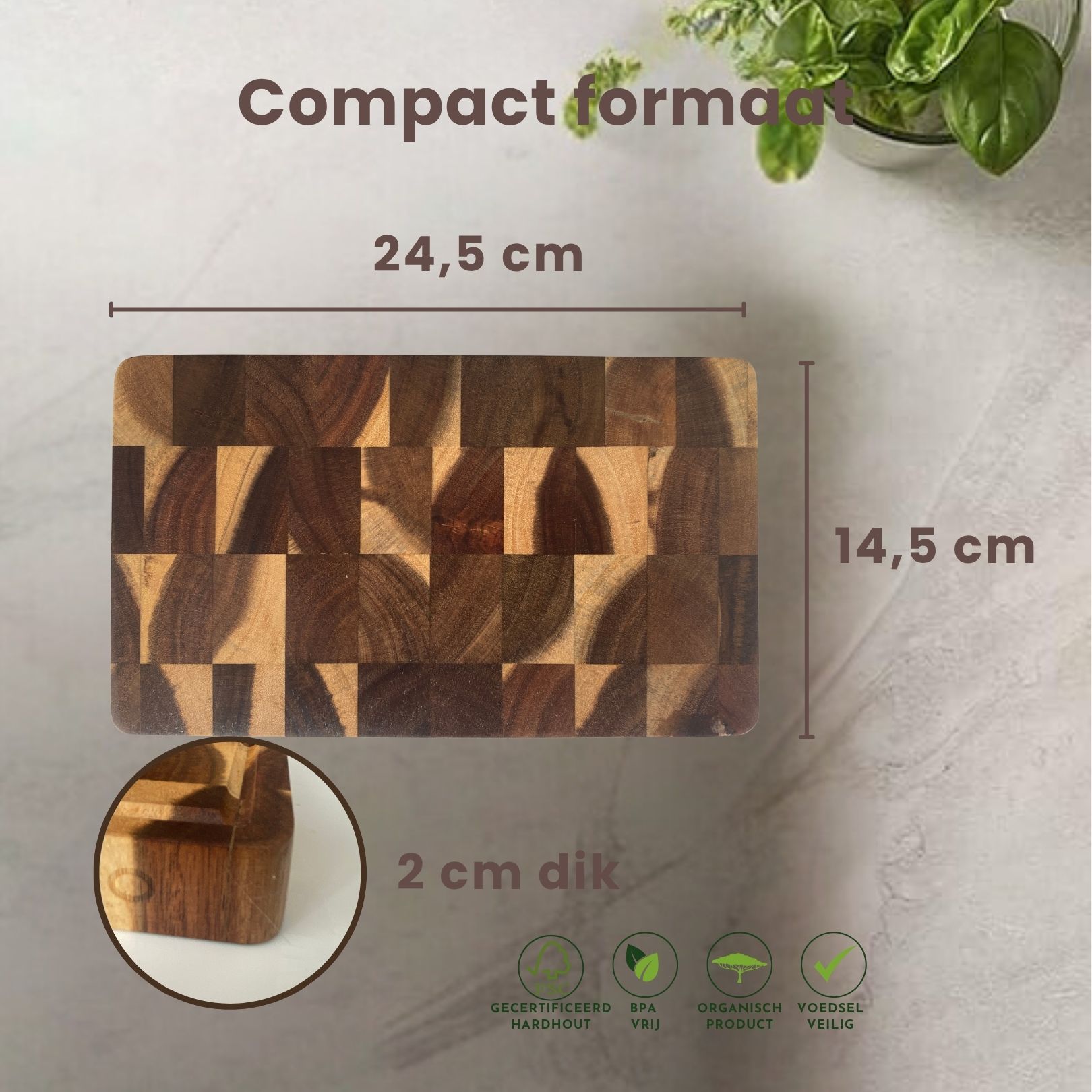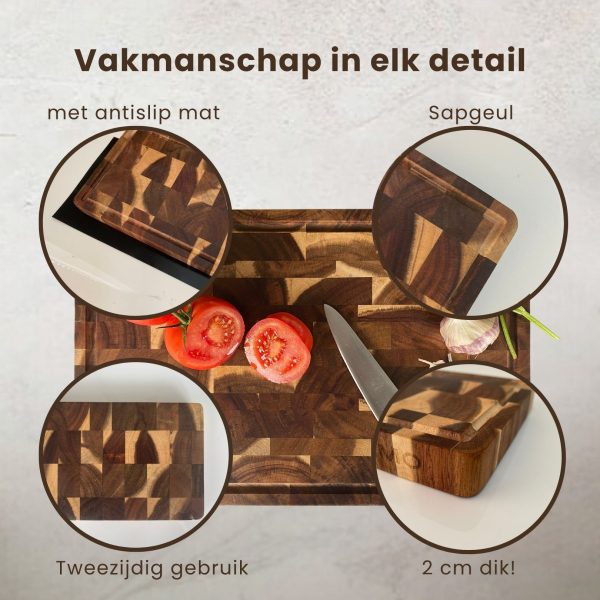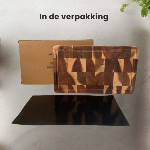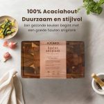 Bovendien is de plank volledig gemaakt van 100% acaciahout, een van de hardste en meest duurzame houtsoorten. Acaciahout staat bekend om zijn natuurlijke antibacteriële eigenschappen, waardoor je keuken hygiënischer blijft. Daarnaast heeft het een unieke, warme uitstraling door de mooie houtnerven en de rijke kleur, wat deze plank niet alleen functioneel, maar ook een eyecatcher op je aanrecht maakt. Dit hout is sterk, duurzaam en toch vriendelijk voor je messen, waardoor je snijgereedschap langer meegaat.
