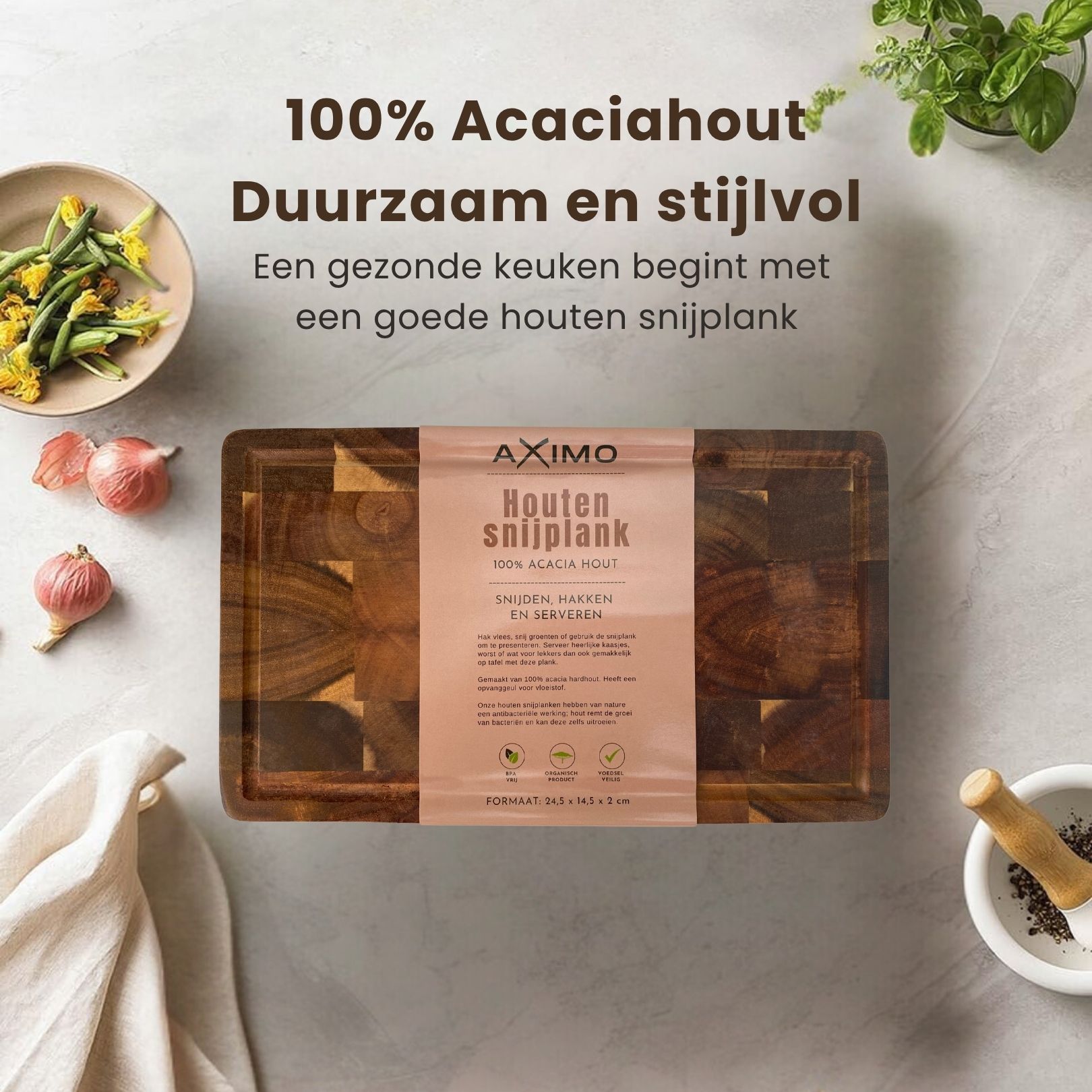 Til jouw kookervaring naar een hoger niveau met de AXIMO Professionele Snijplank Compact, gemaakt van hoogwaardig massief acaciahout. Deze robuuste snijplank is perfect voor al je dagelijkse snijwerk en biedt tevens een stijlvolle manier om hapjes te presenteren. Dankzij het duurzame FSC-gecertificeerde acaciahout blijft je snijplank niet alleen mooi, maar spaart het ook je messen, zodat ze langer scherp blijven.