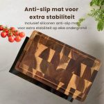 De plank is extra veelzijdig: je kunt beide zijden gebruiken. Eén zijde is voorzien van een praktische sapgeul die vocht en kruimels opvangt, waardoor je werkblad schoon blijft. De meegeleverde de anti-slip mat zorgt voor extra stabiliteit tijdens het snijden.