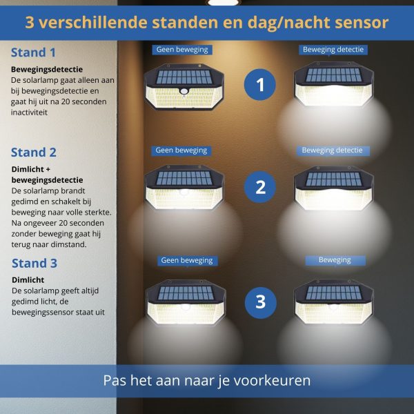 Monteer de lamp eenvoudig met de bijgeleverde schroeven aan een muur of schutting. Zorg ervoor dat de lamp op een plek hangt waar hij voldoende zonlicht kan vangen voor optimale werking. De lamp is ontworpen om het hele jaar door te functioneren, zelfs in slechte weersomstandigheden. Dankzij de bewegingssensor en verschillende standen is de lamp uiterst gebruiksvriendelijk en functioneel.