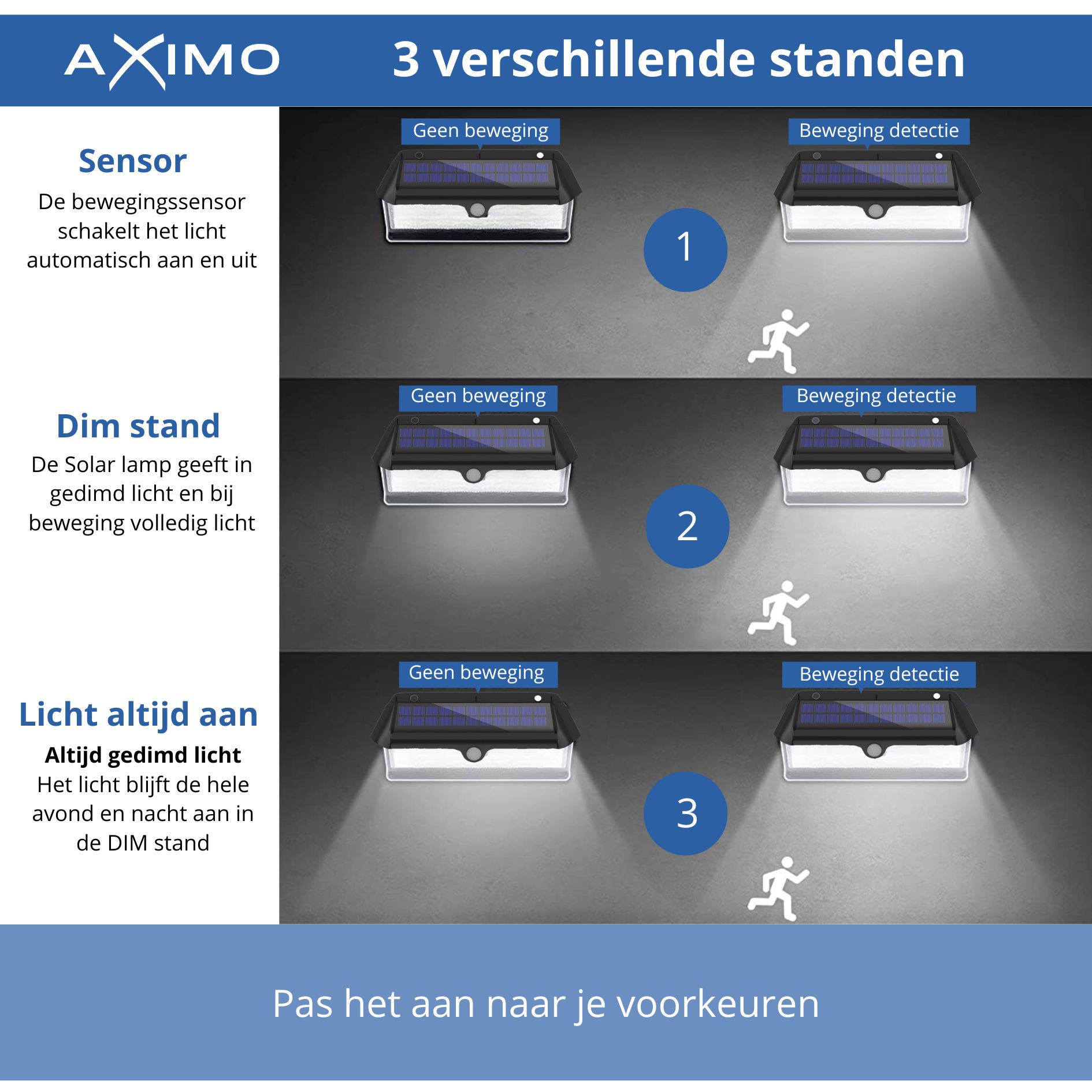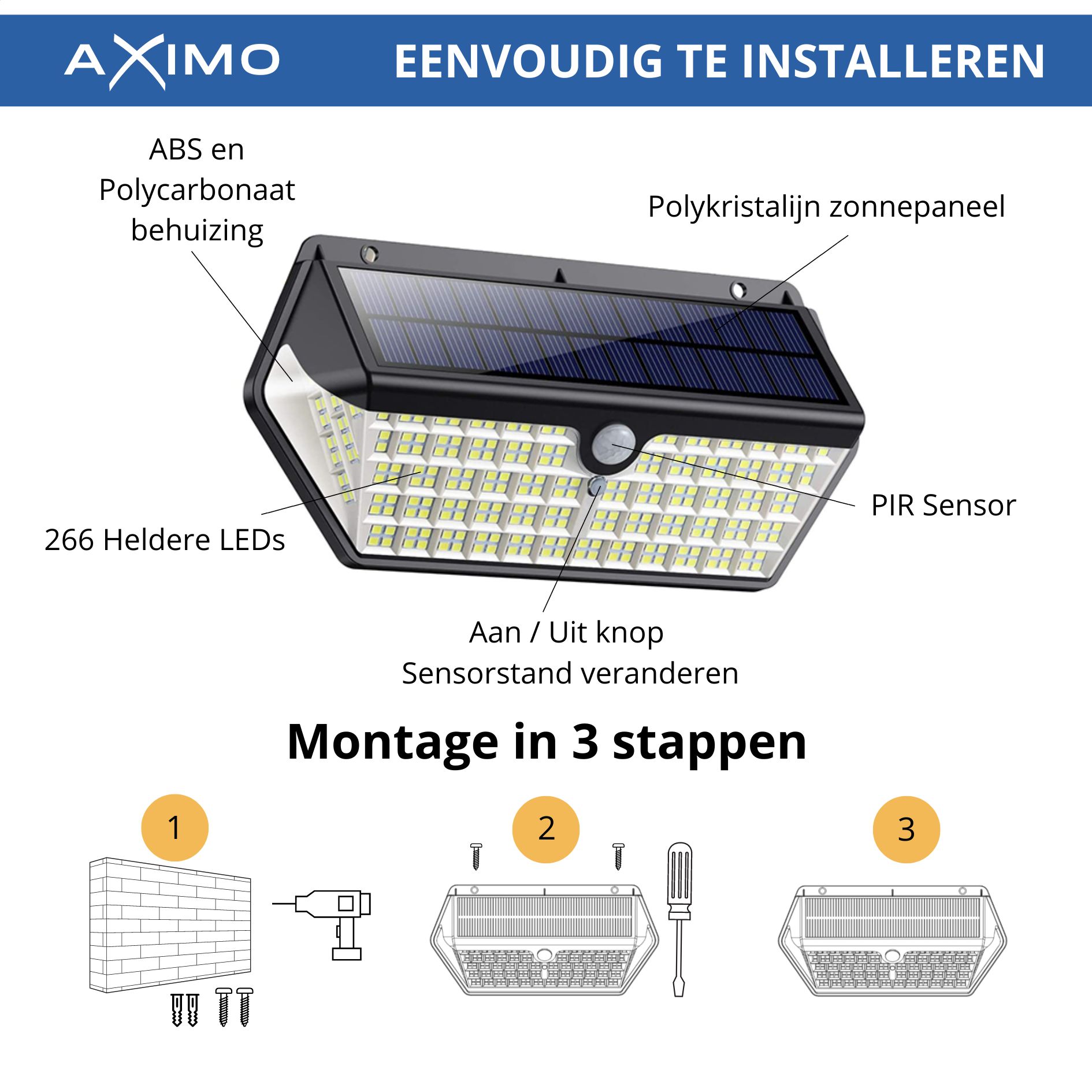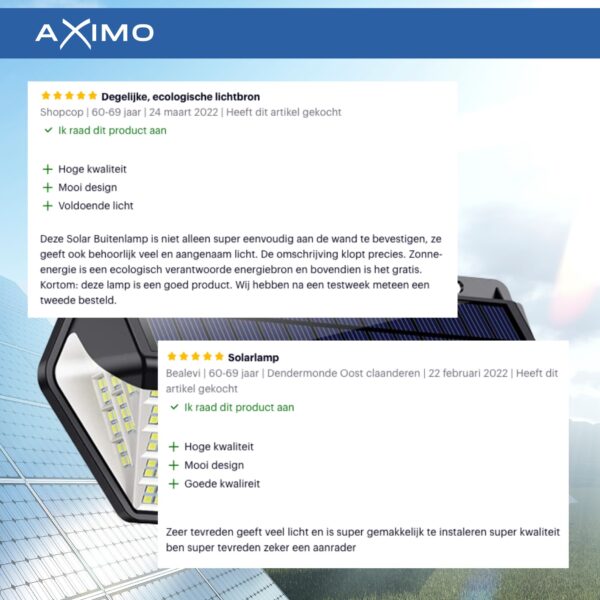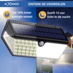 Verhoog de veiligheid en verlicht je buitenruimtes met de Aximo solar buitenlamp. Deze krachtige lamp met 266 LED’s biedt helder licht en is uitgerust met een bewegingssensor die beweging detecteert tot 5 meter. Het slimme design met een 270 graden verlichtingsbereik zorgt voor een brede en effectieve verlichting. Dankzij de drie instelbare standen, waaronder een dimlichtmodus, kun je de lamp aanpassen aan jouw behoeften. De lamp is waterdicht (IP65) en wordt aangedreven door een polykristallijn zonnepaneel, waardoor hij energiezuinig en milieuvriendelijk is.