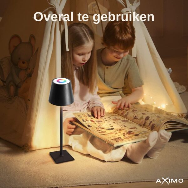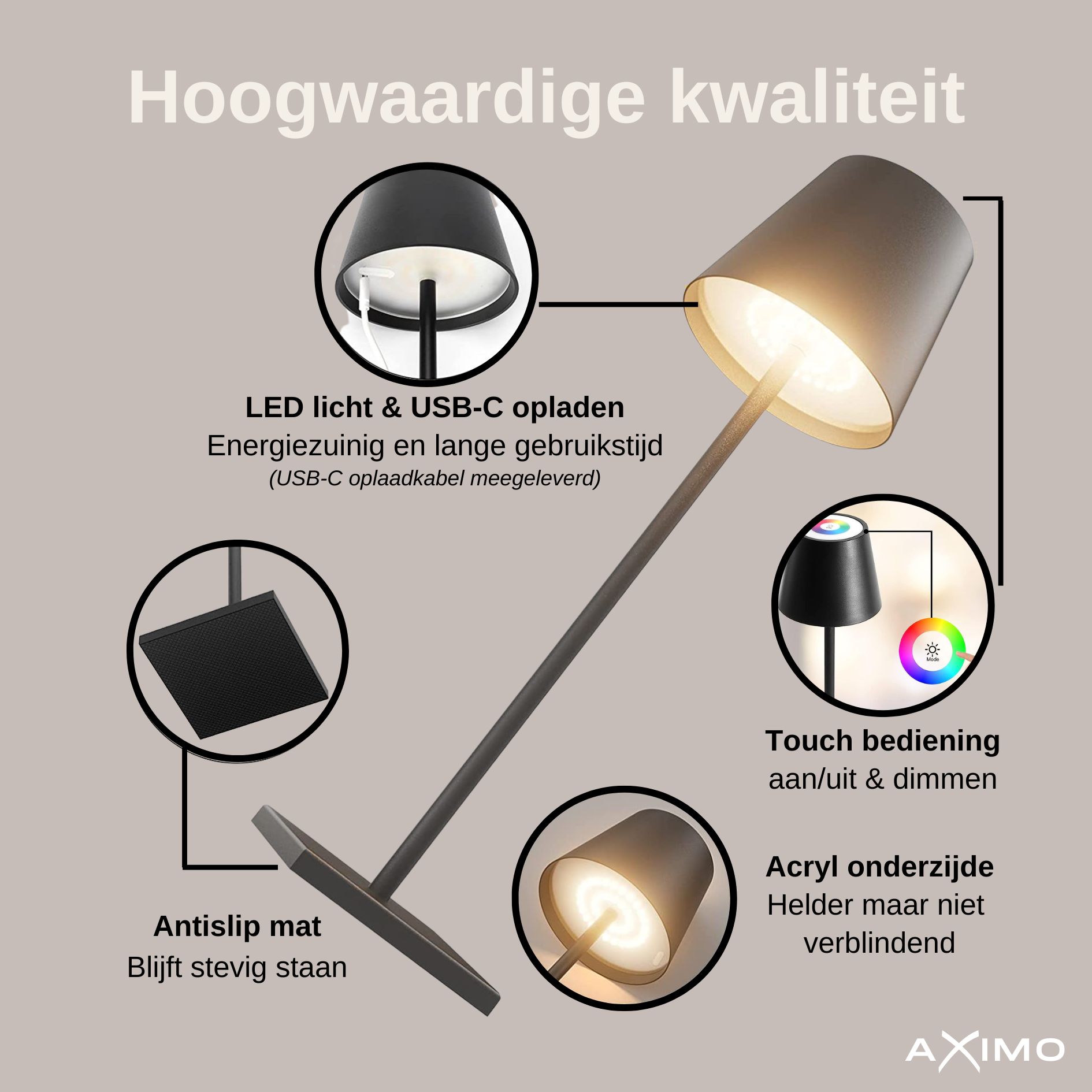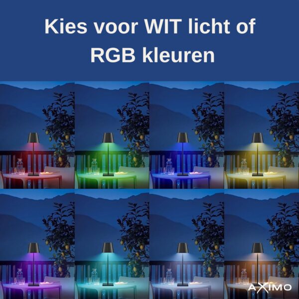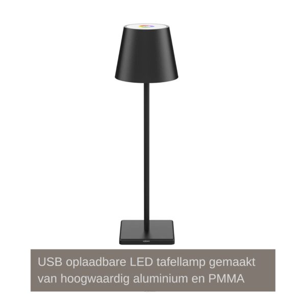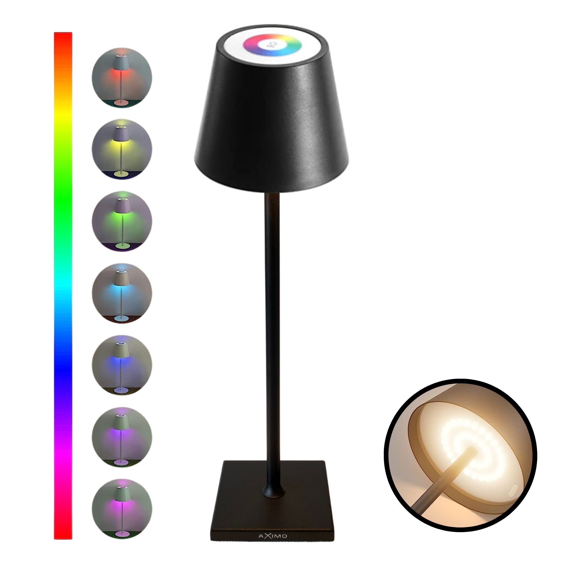 Ervaar de perfecte verlichting met de AXIMO oplaadbare tafellamp. Deze elegante lamp, vervaardigd uit zwart aluminium, biedt zowel helder warm wit licht als een spectrum van levendige RGB-kleuren. De lamp is compact en veelzijdig, ideaal voor zowel binnen- als buitentoepassingen, zoals op kantoor, in de tuin, of op het terras. Dankzij de ingebouwde oplaadbare batterij geniet je van draadloos gebruik en eenvoudige oplading via USB.