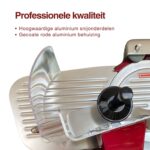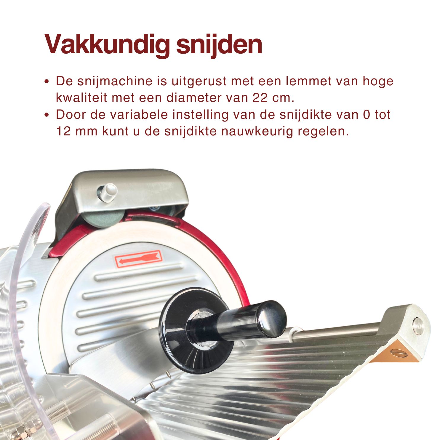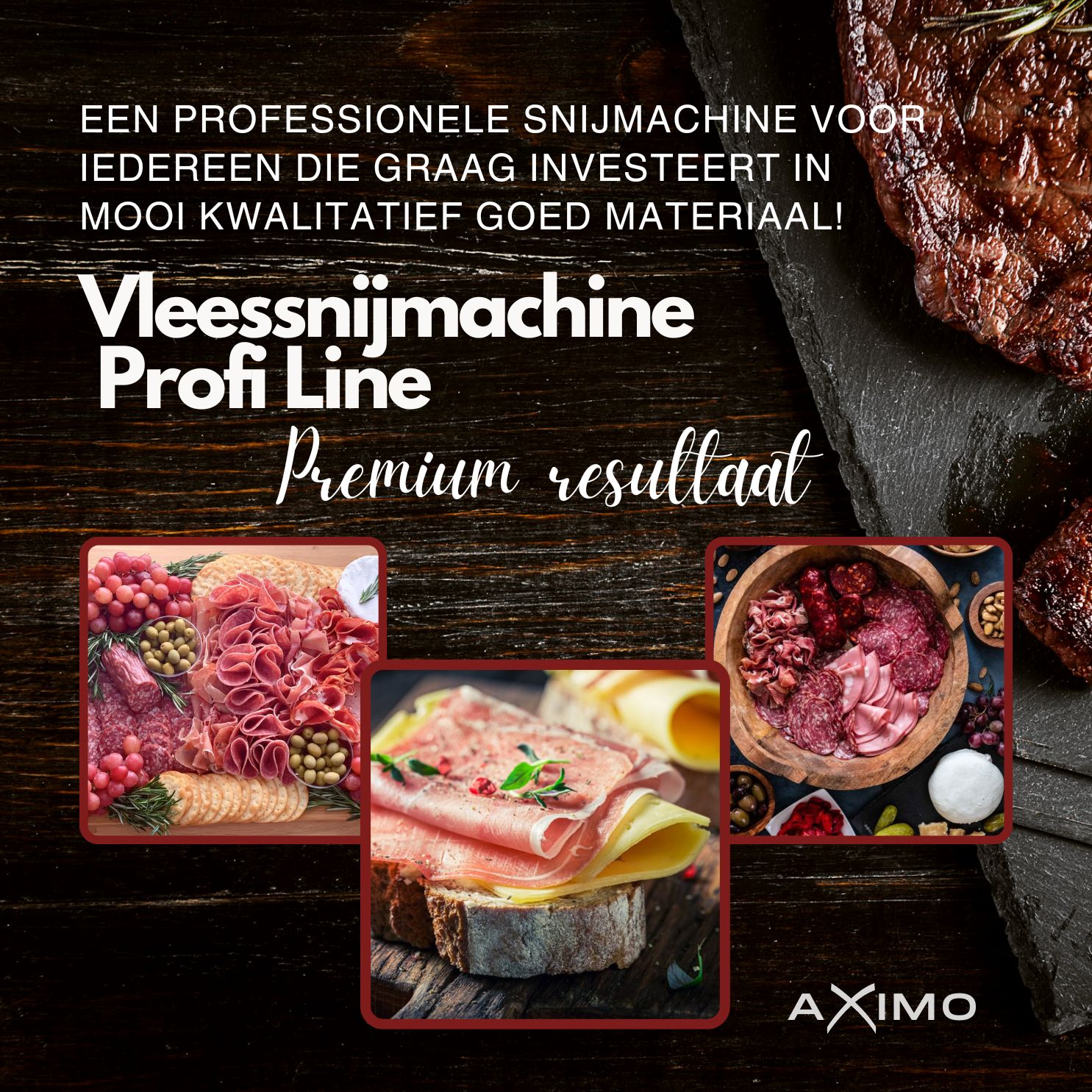 Deze professionele snijmachine van AXIMO is speciaal ontworpen voor het vakkundig snijden van een groot aantal producten. Ben je op zoek naar een vleessnijmachine voor jouw beroepsmatige keuken? Ook voor de hobbychef is de vleessnijmachine van AXIMO een aanwinst! De snijmachine is uitgerust met een snijmes van hoge kwaliteit met een diameter van 22 cm. Door de variabele instelling van de snijdikte van 0 tot 12 mm kunt je de snijdikte nauwkeurig regelen. De krachtige motor met 280 Watt vermogen garandeert een perfect resultaat. Met de ingebouwde messenslijper is het apparaat eenvoudig te onderhouden. Voorzien van een groot blad voor het eenvoudig plaatsen van grote stukken vleeswaren.