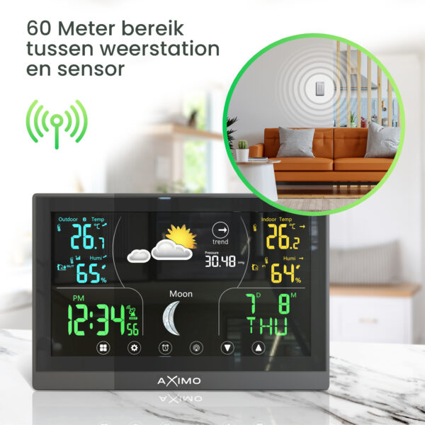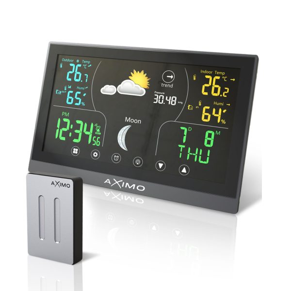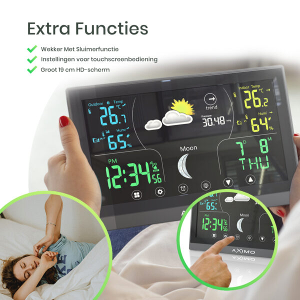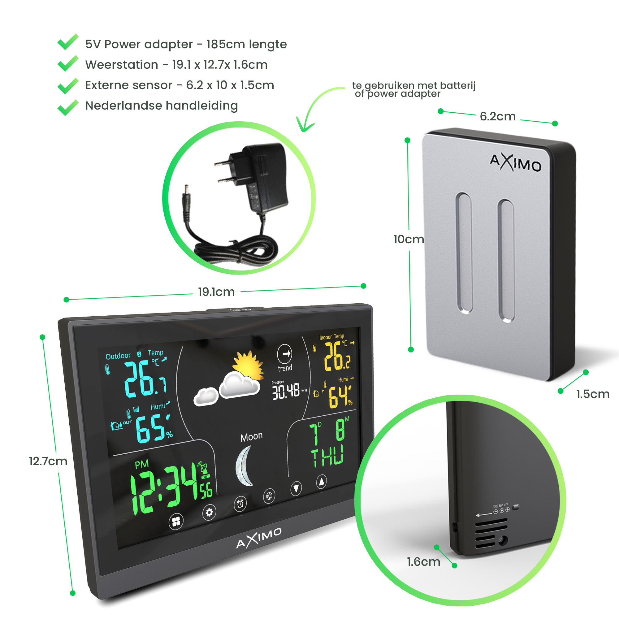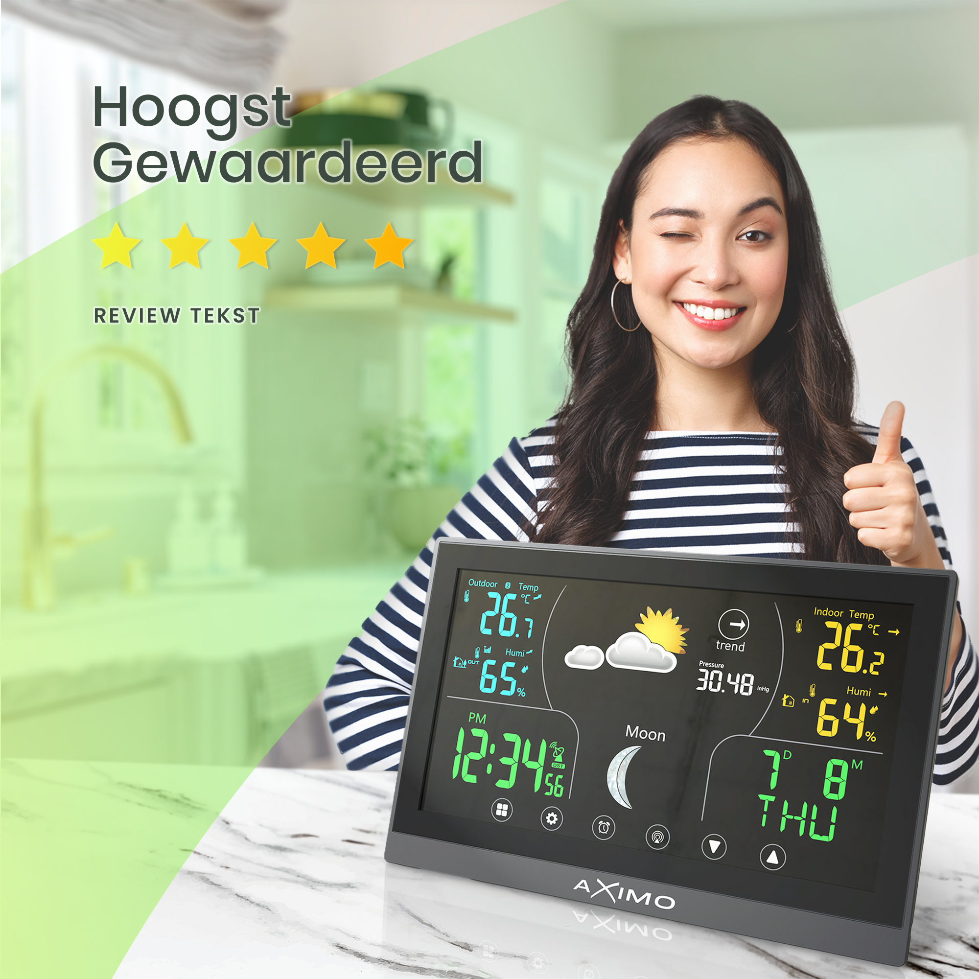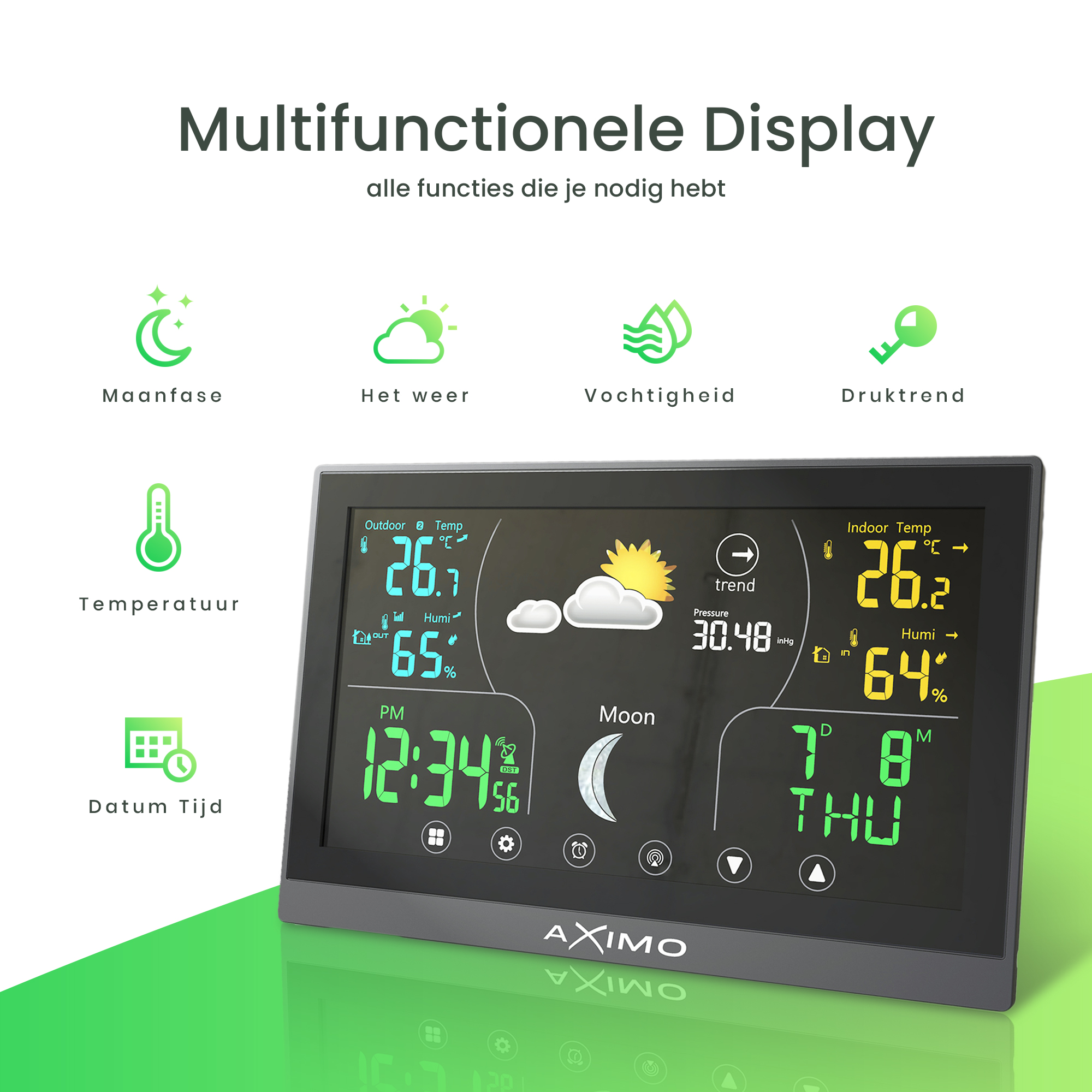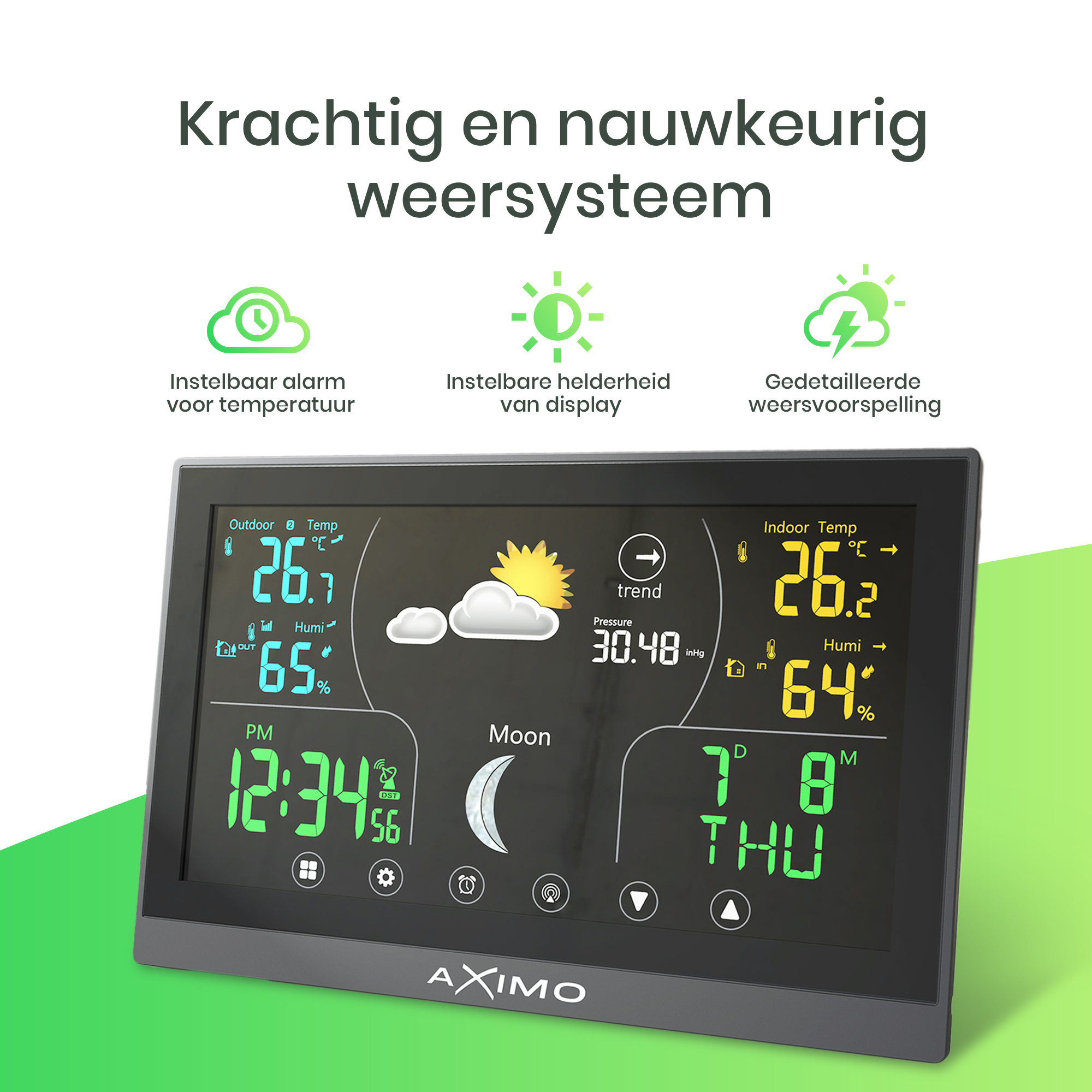 Dit geavanceerde weerstation van AXIMO biedt gedetailleerde informatie over de huidige binnen- en buitentemperatuur, luchtvochtigheid, weersvoorspellingen, maanstand, en de tijd. Het HD-scherm is zowel vanuit elke hoek goed leesbaar als eenvoudig te bedienen via een touchscreen.