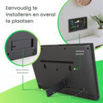 Flexibele Plaatsing: Ophang- of neerzetmogelijkheden met bijbehorende ophanggaten en inklapbare standaard.